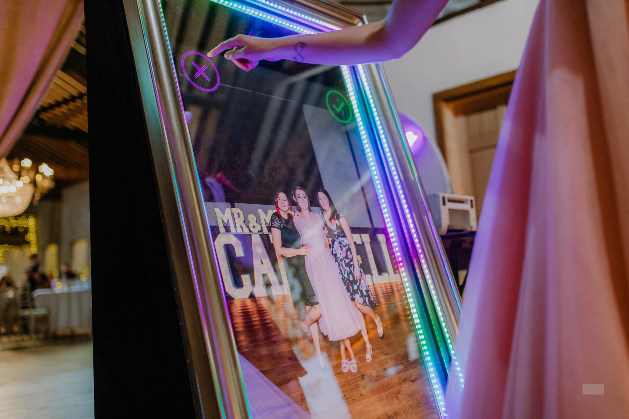 The Mirror Booth is a high-tech photo booth disguised as a sleek, full-length mirror. Guests are greeted by their reflection and guided through the photo process with interactive animations and touch-screen prompts. This innovative setup allows users to sign their photos, add digital props, and customize overlays directly on the mirror’s surface.